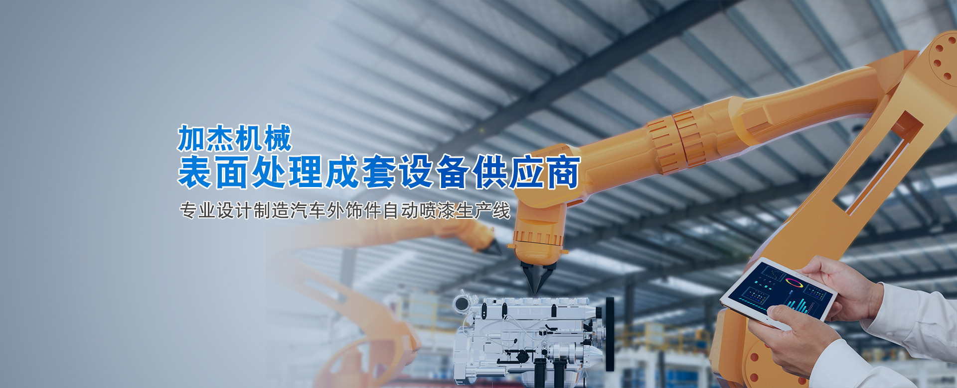 加杰智能裝備(廣東)有限公司是廣州市加杰機械設備有限公司的全資子公司,加杰成立于2007年。是一家專業于表面處理行業智能化涂裝設備的研發(fā)、設計、制造、安裝與售后為一體的綜合型企業,專業于塑膠、金屬部件的噴漆、電泳、噴粉等成套自動涂裝線交鑰匙工程。 公司在廣州花都和廣清產業園均有自建研發(fā)及生產基地,占地面積六萬余㎡,旗下有加杰智能、川捷智能、漢潔科技、泰國加杰四家子公司。公司同華南理工、廣工、北理工等知名大學院校展開深度合作,并積極展開自主創(chuàng)新和...